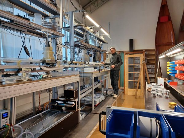 Sein Experimental- und Vorführmodell der Wasserreinigungsanlage, die Schmutzpartikel absondert bis zu einer Winzigkeit von 50 Mikrometern, z.B. auch Microplastik.